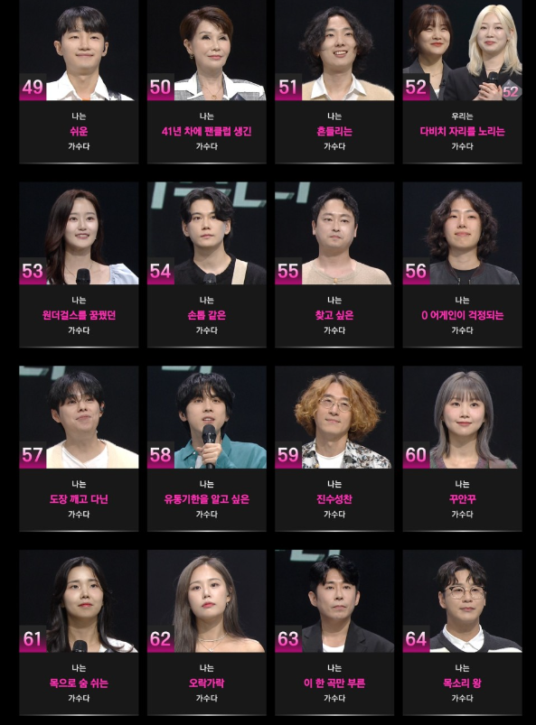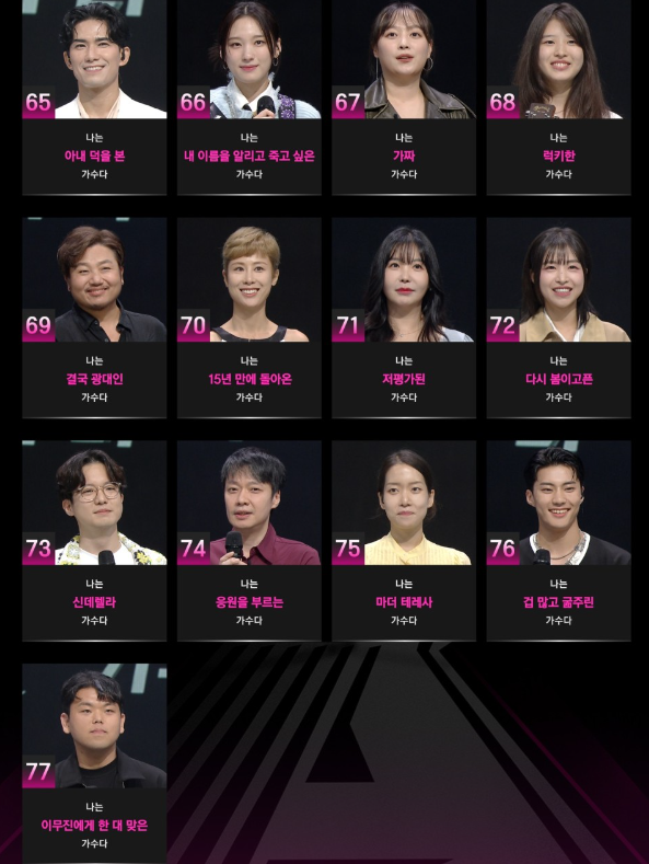 싱어게인3 출연진들은 "나는 ~~ 가수다"로 자신을 표현합니다. 그 안에는 그 가수만의 특징이나 살아온 사연이 녹아 있기도 합니다. 자신이 어떤 가수인지 표현해 놓아서인지 시청자들에게 각인시킬 킬포가 되는 것 같다는 생각이 듭니다. 자신의 색깔과 개성이 돋보이는 참가자들이 많습니다.