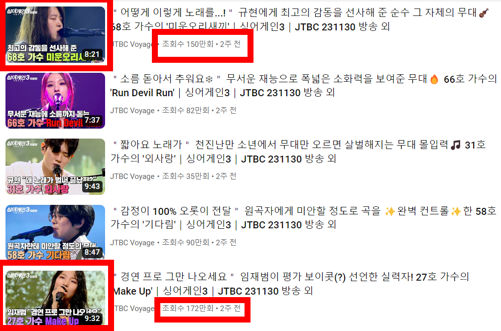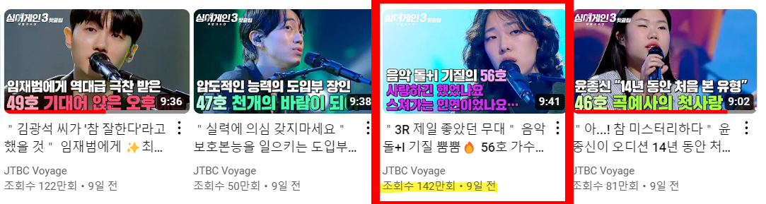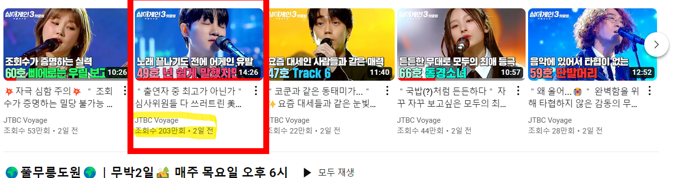 지난 12월 14일 TOP10 진출자 중 유튜브 조회수가 압도적인 49호님의 "넌 내게 쉽게 말했지만"이 203만 회입니다.