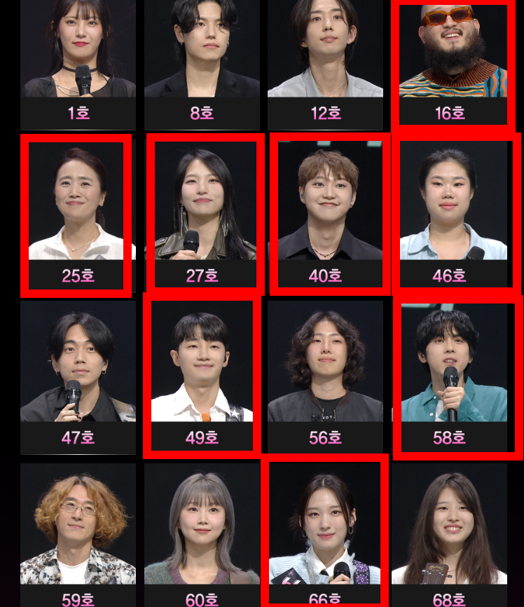 TOP10 진출자 확정 8인은 16호, 25호, 27호, 40호, 46호, 49호 58호, 66호 입니다. 사전투표 5위권 안에 드는 56호와 1,2위를 오가던 68호의 탈락은 예상치 못한 반전이었습니다. 패자부활전에서 더 멋진 모습 보여주리라 기대해봅니다.