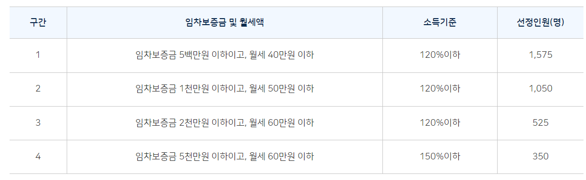 - 임차보증금, 월세 및 소득 기준 4개 구간으로 나누고 선정인원 초과 시 구간별 전산 무작위 추천/ 3,500명