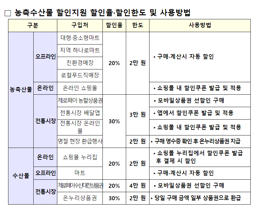 할인대전은 대형마트, 온라인 쇼핑몰, 전통시장 등 다양합니다. 대상품목으로는 한우, 돼지고기, 닭고기, 생선, 채소, 과일, 제수용품 등입니다. 할인율은 품목별로 다르지만 최대 60%까지 할인된 가격으로 구매 가능합니다.