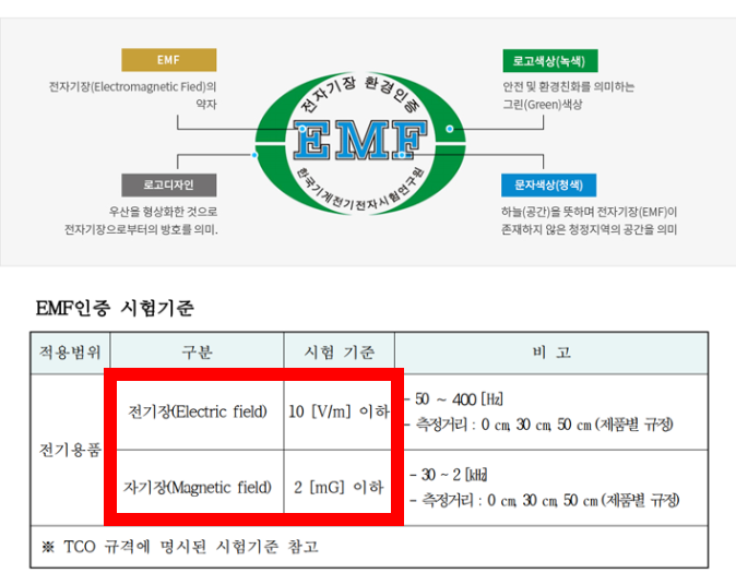- 전자기장 환경 인증 마크가 있는 것으로 구입하시기 바랍니다. EMF 기준 전기장 10V/m 이하, 자기장 2mG 이하의 제품을 구입하시면 됩니다.